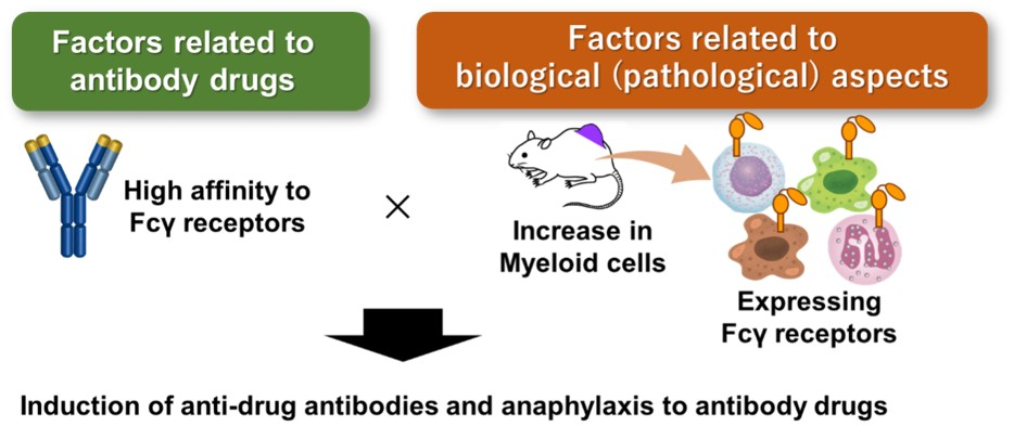 今回の研究は、これらの動物モデルと抗体医薬を比較解析することで、なぜアナフィラキシーが発症してしまうのか、そのメカニズムを詳細に解析しました。その結果、抗体医薬のFc部分がFc受容体と親和性の高い抗体だと、がんで増加する骨髄系細胞にFc受容体を介して取り込まれることで異物として認識され、抗体医薬に対する抗薬物抗体(ADA)産生が亢進してしまうことが、アナフィラキシー発症を促進してしまうメカニズムであることが分かりました。副作用自発報告データベースにおいても、Fc受容体への親和性が高い抗体医薬でアナフィラキシー発症報告が高い傾向が見出されました。従って、本研究で明らかになったメカニズムは臨床における発症機序の一部を説明できる可能性が示されました。